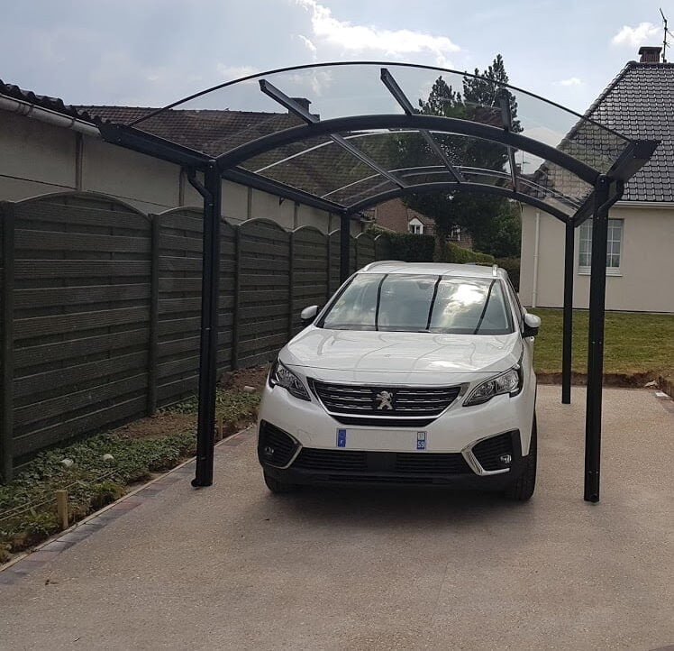 Deze mensen zochten een carport die zou opgaan in het geheel. Geen zware constructie die de aandacht van de woning wegneemt, maar een quasi transparant geheel dat elegant zou aansluiten bij de voortuin. Daarom is er gekozen voor een vrijstaande opstelling met glasheldere dakbedekking.De rustige ligging laat ook toe dat de carport tegelijkertijd als terrasoverkapping kan gebruikt worden. Twee vliegen in één klap: een pergola om 's avonds te genieten van de tuin en bescherming voor de wagen bij vochtig weer gecombineerd in deze overkapping.Ga naar de landingspagina van Carports >