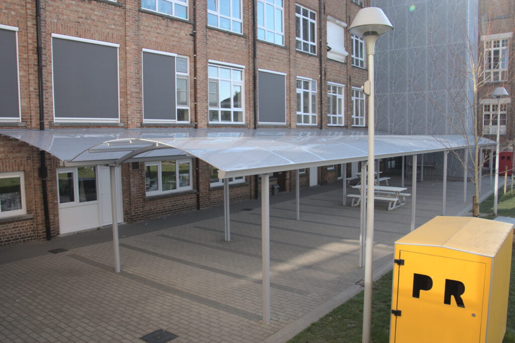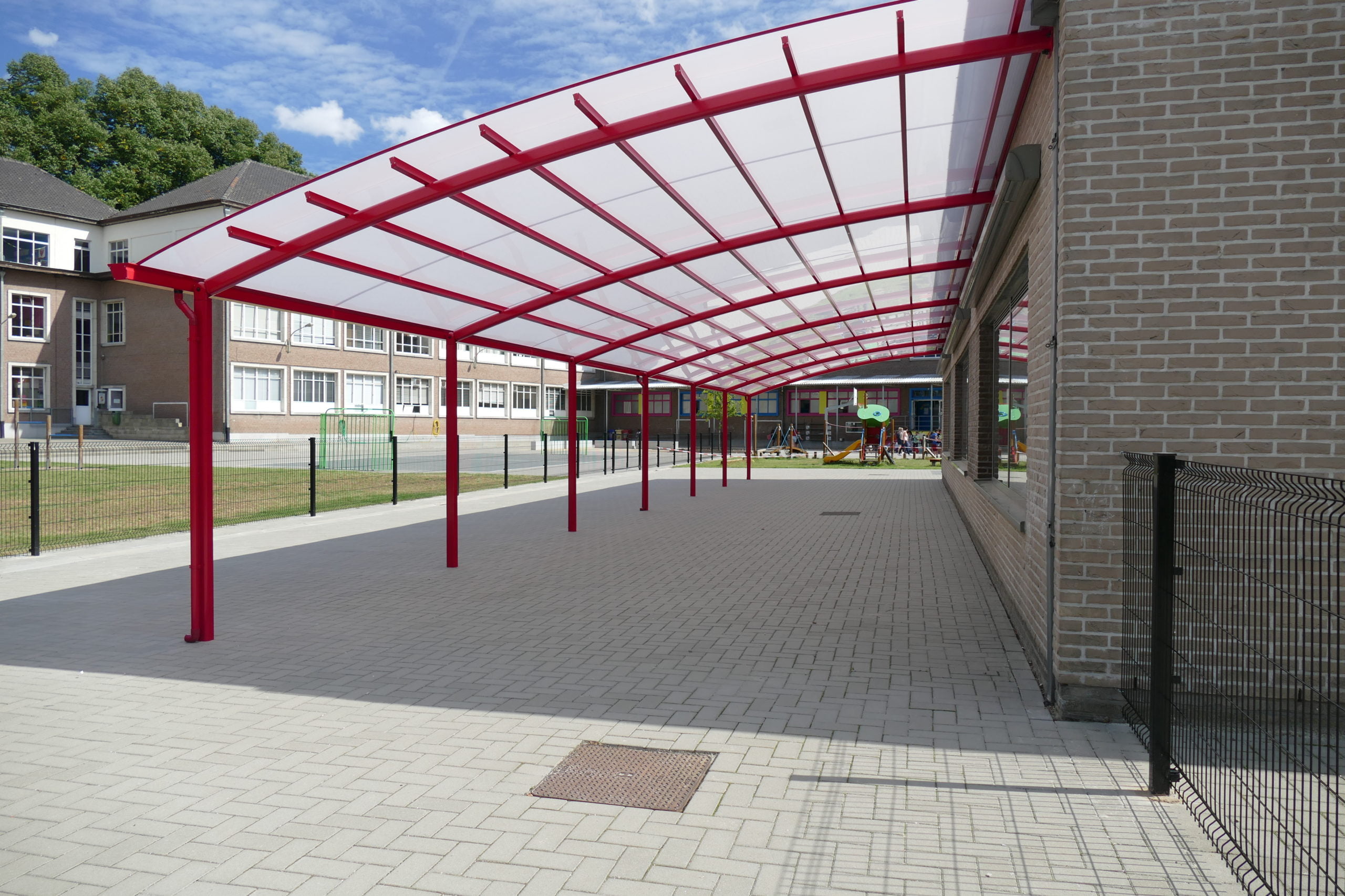 De leerlingen van dit Atheneum kunnen voortaan altijd buiten hun pauze nemen. Dankzij de overkapping met massieve polycarbonaat dakbedekking zijn ze beschermd tegen de felle zon, regen en zelfs de zwaarste hagelbuien.Onze productie is standaard gekeurd door aangemelde keuringsinstantie Vinçotte volgens EN1090-3 Executieklasse 1 certificaat methode 1. Indien gewenst kan ook geproduceerd worden volgens executieklasse 2. Dit houdt in dat je een Belgische kwaliteitsoverkapping verkrijgt, volledig geproduceerd volgens de hoogste Europese normen.Ook voor scholen maken wij volledig maatwerk, aangepast aan de specifieke uitdagingen van het gebouw, zoals hoge ramen, brede openingen, ... Wij houden geen standaard modellen op stock in standaardkleuren, maar zorgen voor een vrolijke kleurrijke overkapping. Het feit dat je niets extra betaalt voor deze kleurkeuze tovert vast en zeker meteen een glimlach op jouw gezicht.Ga naar de landingspagina van speelplaatsoverkappingen >